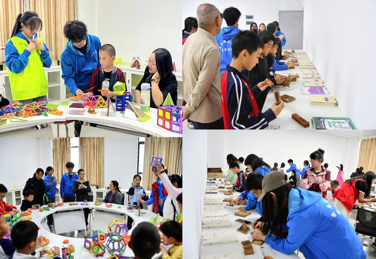 志愿者带领小朋友和家长参观学院内的数学模型展览室,形象生动地介绍室内各种先进现代教具和大量数学模型,积极与家长和小朋友交流解惑。数学模型展览馆的先进模型教具与院史馆的老式教具和手写教材形成鲜明对比,让小朋友们切实体验到了学院发展至今的不易,进一步加深了对数学展馆的印象。同时,志愿者们引导小朋友和家长一起探索模型构架,开展模型解密游戏,在轻松愉快的氛围中锻炼了小朋友的动手能力,培育了数学思维。
