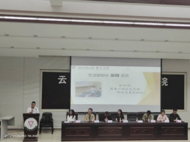 2021年5月30日下午,数学学院在同析4-201报告厅如期举行。学院团委书记于伯浩、团委副书记张富萱、组织委员丁锦晞、宣传委员洪枭倩以及学院学生会全体成员出席本次大会。
