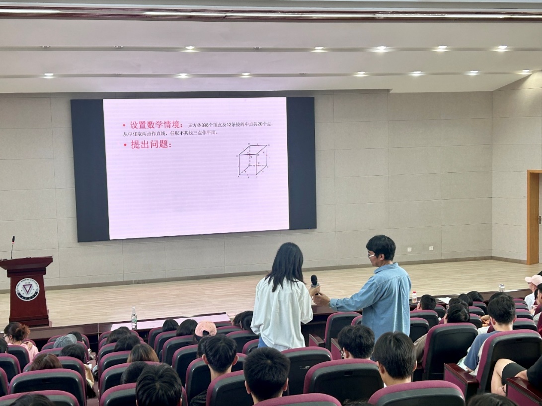 互动环节中,王校长现场布置教学设计任务:以“平行四边形对角线互相平分”为内容,运用“问道课堂”理念设计教学方案。在场学生积极参与,四位同学上台分享设计思路。