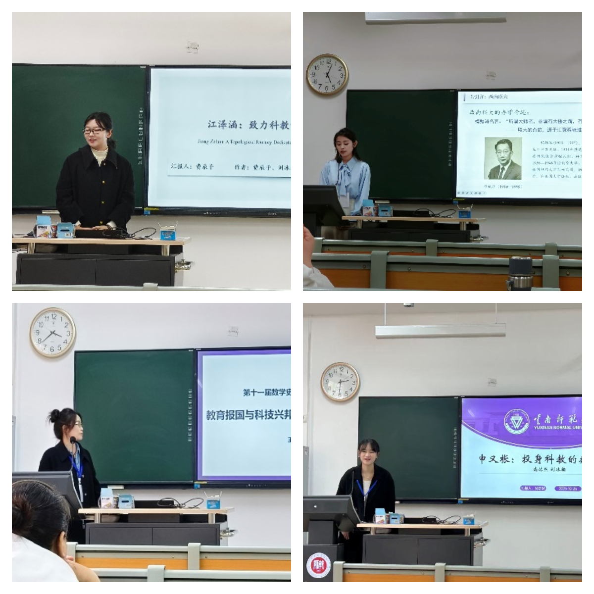 云南师范大学数学学院始终将研究生学术能力建设放在人才培养的核心位置,高度重视研究生进行学术交流。2023级学科教学(数学)专业硕士研究生费辰予作题为《江泽涵:致力科教的拓扑人生》的分组报告;2024级学科教学(数学)专业硕士研究生王帆、张敏、尚浩然分别作题为《教育报国与科技兴邦:西南联合大学数学家徐贤修》《微分方程的拓荒者:西南联大数学家程毓淮》《申又枨:投身科教的数学大师》的分组报告。4名硕士研究生的报告得到与会专家好评,展现了学院研究生培养的过硬质量。
