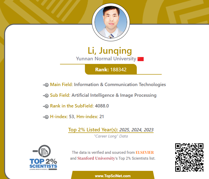李俊青,云南师范大学高层次人才,教授,博士,博士(硕士)研究生导师,IEEE Senior Member, 中国仿真学会智能仿真优化与调度专委会常务委员、中国运筹学会排序分委会理事,担任SCI一区期刊《Expert Systems with Applications》副主编,ESCI三区期刊《IET Collaborative Intelligent Manufacturing》副主编。主要从事深度强化学习、生产计划与调度、智能优化算法及应用、智能信息处理等方面的研究。入选2021年“全球顶尖前10万科学家”,2020~2025年“全球前2%顶尖科学家终身成就榜”,获山东省自然科学二等奖2项。作为主持人承担国家自然科学基金5项(其中面上项目4项)、云南省基础研究重点项目1项,作为带头人主持云南省教育厅科技创新团队项目1项。发表SCI论文90余篇(其中,IEEE Trans等顶级期刊论文15篇,18篇ESI高被引论文,5篇ESI热点论文),H-因子57。授权发明专利25件,科学出版社出版专著2部。获2025年云南省引进高层次人才政府补贴。获2026 IEEE CIS Outstanding Paper Award (IEEE CIS 最佳论文奖,全球仅8篇获奖论文)。