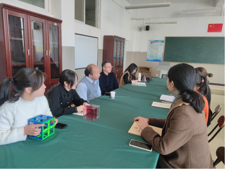 讲解结束后,云南衡水实验中学呈贡校区小学部数学课老师和学院师生举行了座谈交流。会上小学部数学课老师们此次活动给予了肯定从中学习到了科普开展的方向方法以及对教学的促进作用。他们认为,今天讲解的内容新奇,内容很好,激发了学生的学习兴趣丰富了课堂数学教学,希望以后继续加强培训交流。同时,对此次讲解提出一些宝贵的意见,希望课前充分了解学情,如教学进度等。王天志代表学院对学校给予此次活动的大力支持信任表示真诚的感谢